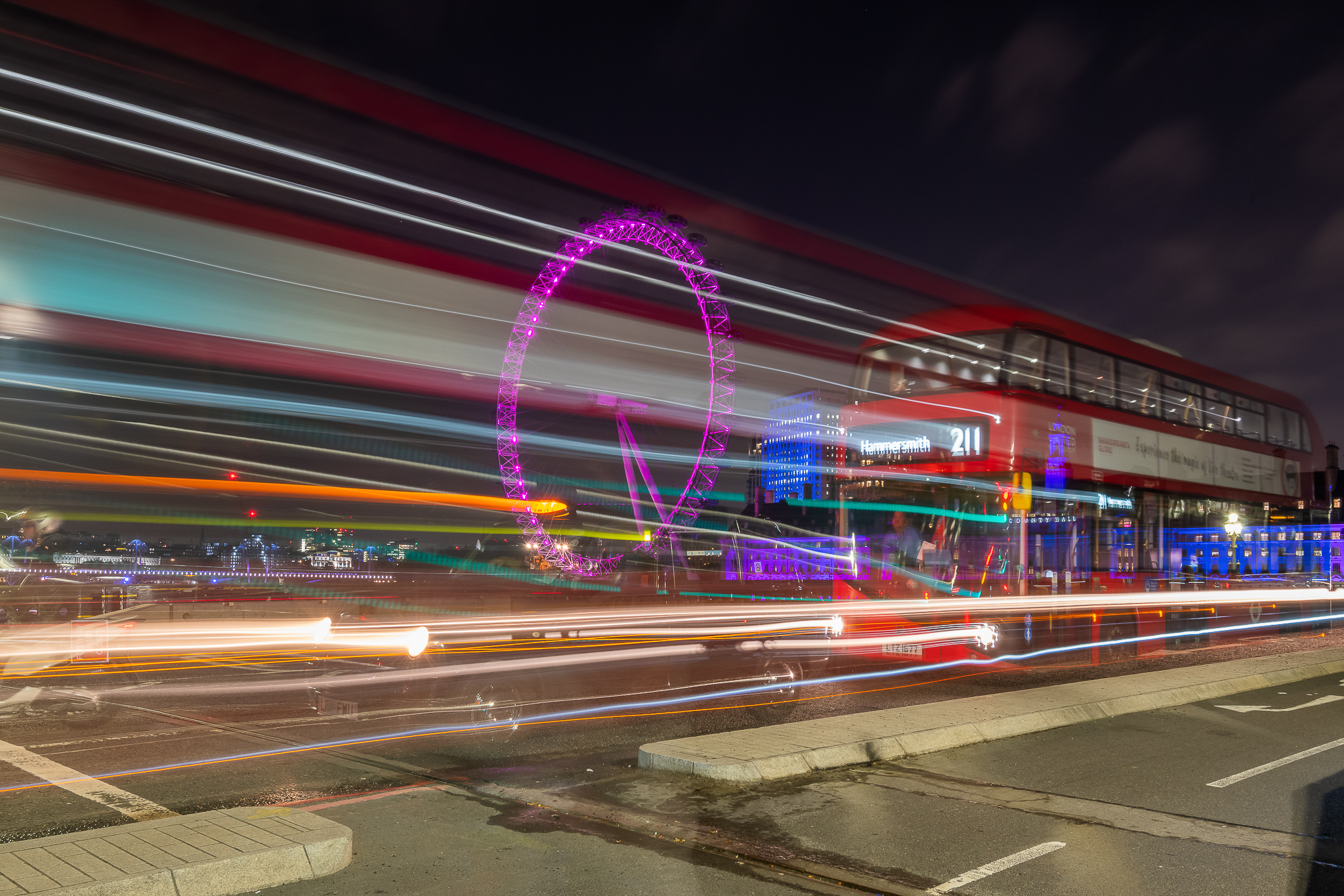 London at Night – There was lots of traffic crossing Westminister bridge in front of the Millennium Wheel and I was able to capture the Hammersmith bus passing to combine some iconic sights and places in London.